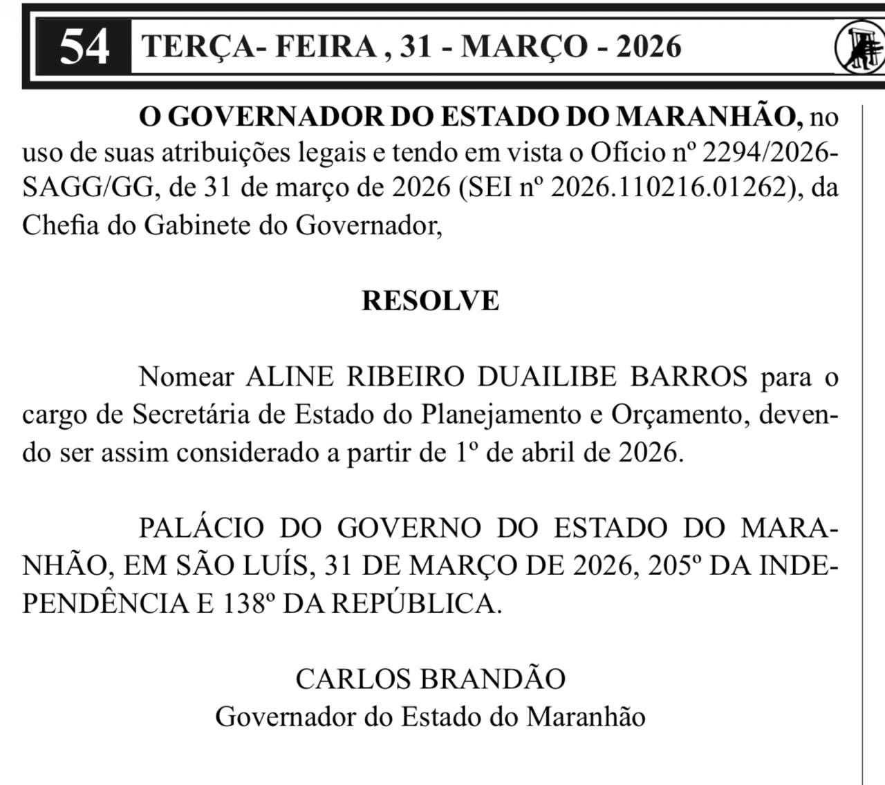 A economista Aline Ribeiro Duailibe Barros é a nova secretária de Planejamento e Orçamento do Maranhão (Seplan). O ato de nomeação foi publicado já nesta quarta-feira (01). Aline já era responsável pela Subsecretaria, e com a saída de Vinícius Ferro para disputar as eleições, ela foi a escolhida para comandar a Secretaria daqui pra frente.