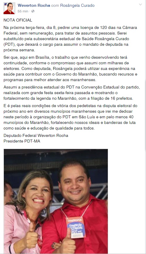 Veja abaixo, na íntegra, a nota publicada em sua rede social, pelo deputado federal do PDT, Weverton Rocha, sobre o pedido de licença do seu mandato: