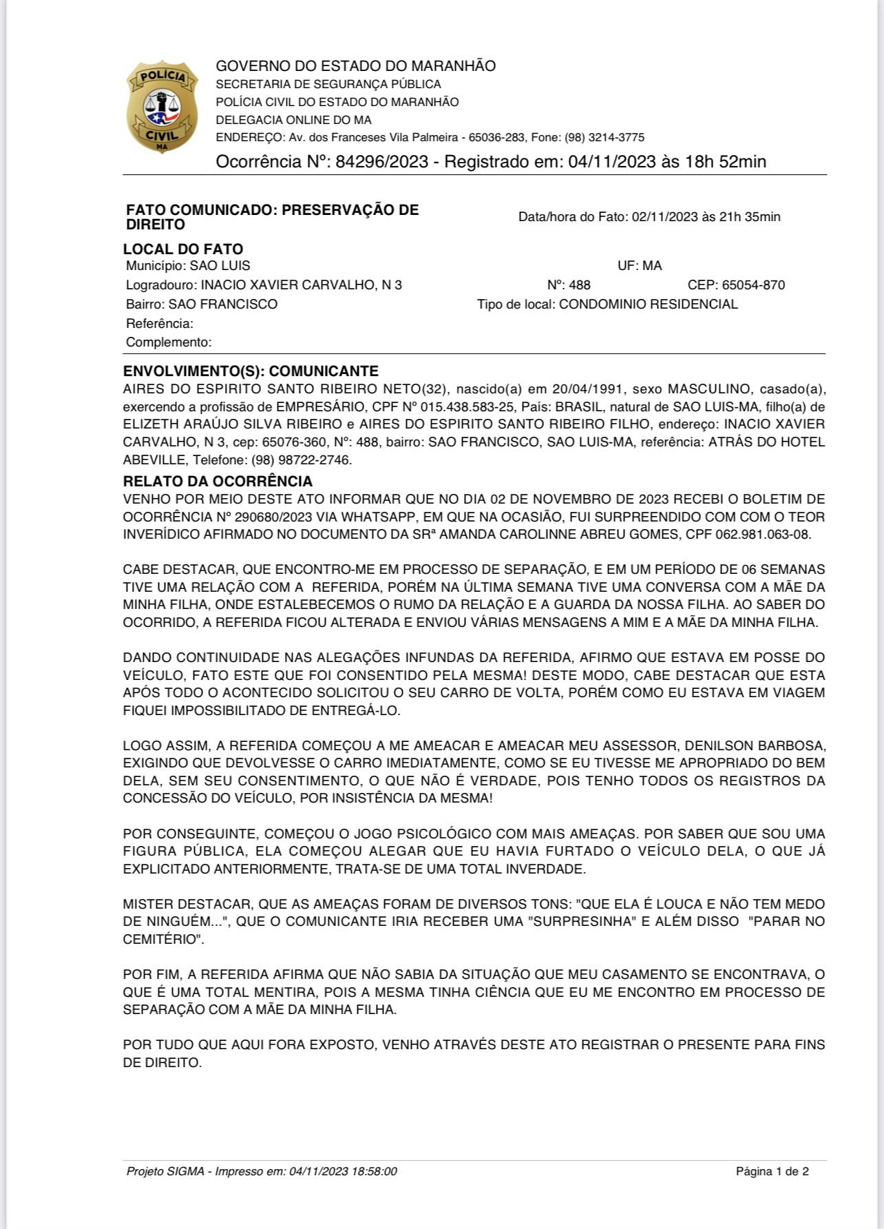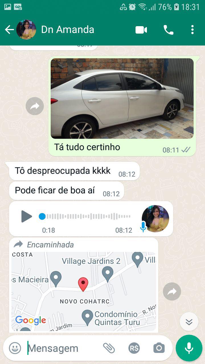 Este blog teve acesso ao boletim de ocorrência registrado pelo parlamentar, além da conversa que comprova que o carro da nutricionista estava em posse do mesmo com ciência dela. Para ele, a atitude é uma demonstração da sua tranquilidade e do seu interesse em solucionar a questão o mais rápido possível e da forma correta.