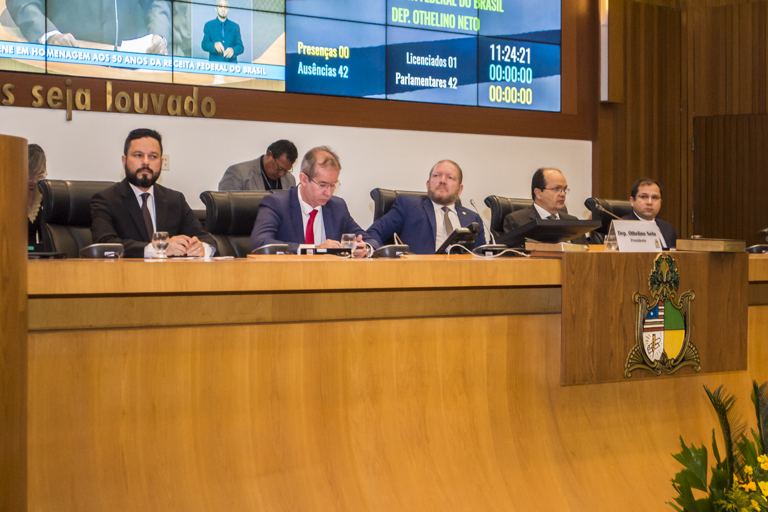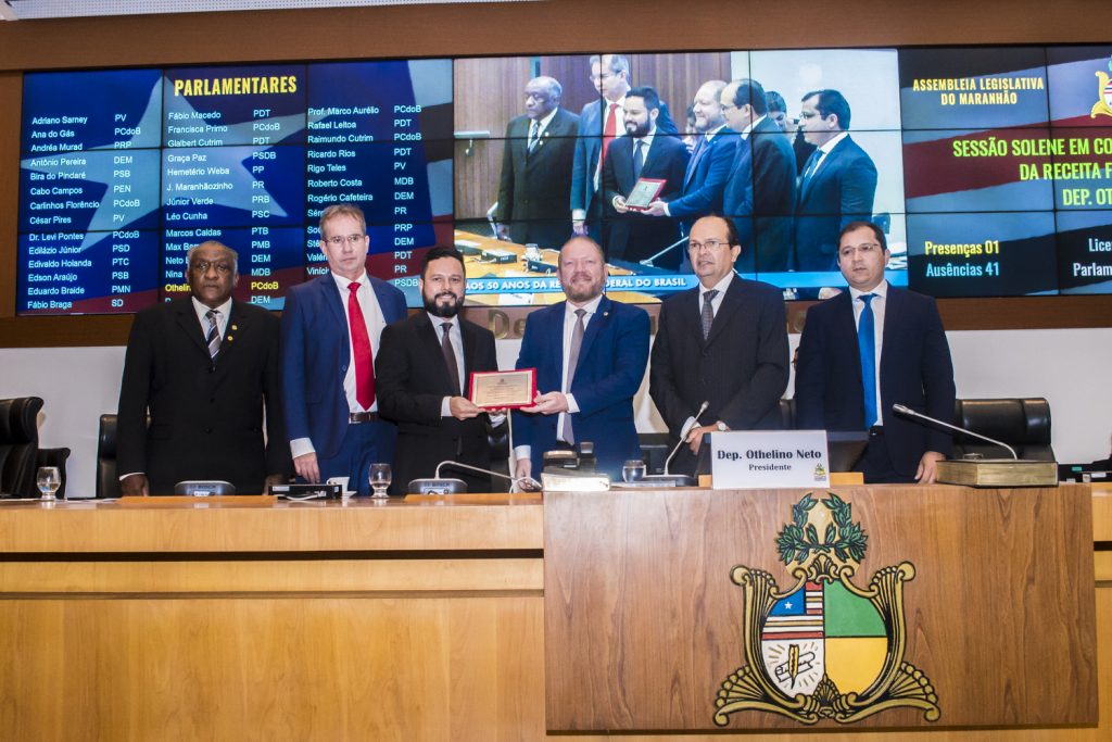 Na manhã desta quarta-feira (21), em sessão solene, a Assembleia Legislativa prestou homenagem aos 50 anos da Receita Federal do Brasil. Autor da proposição, o presidente da Casa, deputado Othelino Neto (PCdoB), proferiu discurso destacando a importância da Receita Federal como instituição indispensável ao desenvolvimento econômico e social do país.