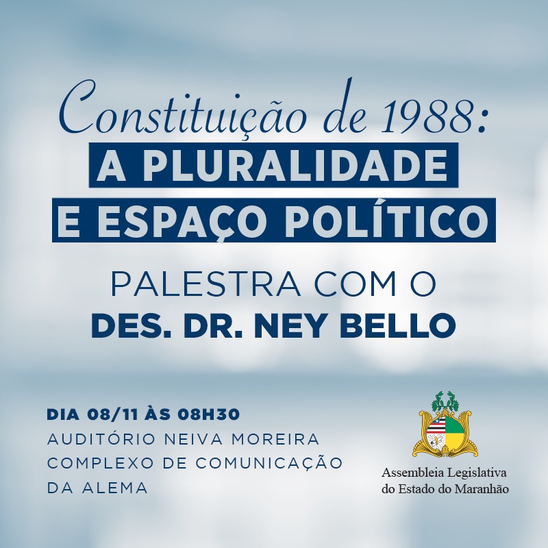 A Presidência da Assembleia Legislativa promoverá, na próxima quinta-feira (8), às 8h30, no auditório Neiva Moreira, do Complexo de Comunicação, palestra do desembargador Ney de Barros Bello Filho com o tema “Constituição de 1988: Pluralidade e Espaço Político”.