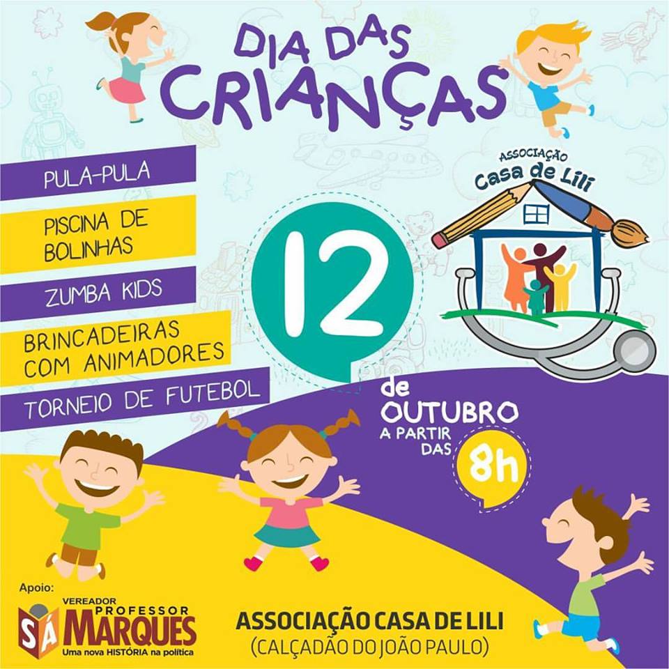 O Dia das Crianças será comemorado com muita alegria e diversão na Associação Casa de Lili, no bairro do João Paulo. O projeto tem o apoio total do vereador Sá Marques.