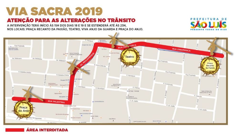 A primeira interdição ocorrerá no cruzamento da Avenida Paquistão com a Avenida Dinamarca. A partir deste ponto, toda a Avenida Dinamarca e as transversais que dão acesso a essa avenida serão interditadas até a Avenida Odilon Costa Filho. O trecho interditado continuará pela Avenida Odilon Costa Filho, passando pela Praça do Anjo, Avenida Vaticano, até a entrada do bairro Anjo da Guarda. A última interdição ocorrerá na Avenida Palestina até a Praça da Ressurreição.