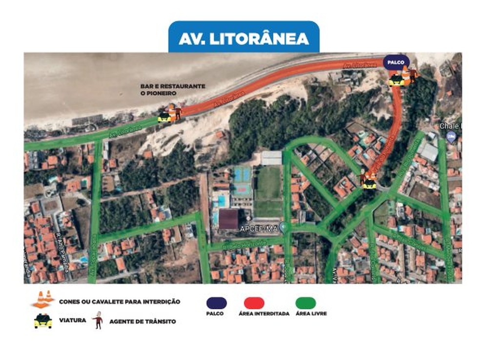 Em relação ao trânsito, fica estabelecido a Avenida Litorânea, trecho compreendido entre o retorno próximo ao Bar Pioneiro até a Ponte sobre o Rio Pimenta (cruzamento da Rua das Graças e Rua Vale Rio Pimenta – Parque Atlântico) para a realização do réveillon. Em decorrência disso, fica proibido o tráfego de veículos nesse trecho, bem como o acesso de veículos nas transversais para a referida área a partir das 5h do domingo (31) até às 5h da terça-feira (2).