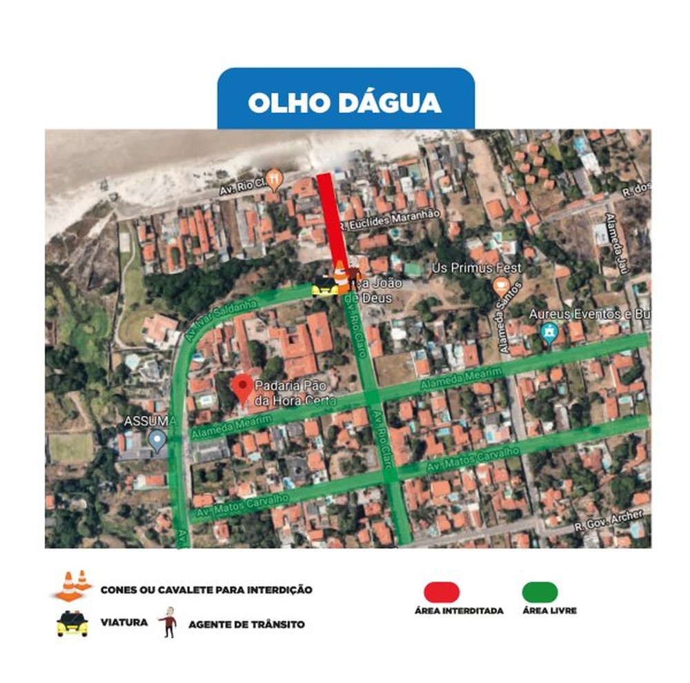 No Bairro Olho d’Água, será interditada a Avenida Rio Claro, que dá acesso à praia. O trânsito será desviado pela Avenida Ivar Saldanha. Agentes de Trânsito estarão no local para fazer o disciplinamento do trânsito e evitar bloqueio da via.