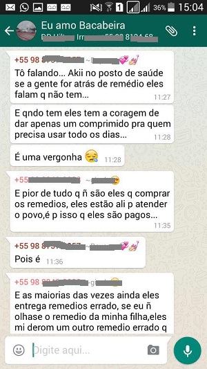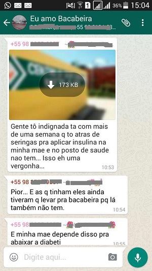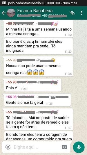 A coisa é pior do que se imagina lá pelas bandas da cidade de Bacabeira. Desta vez, moradores da cidade, que fazem parte de um grupo de WhatsApp, intitulado de “Eu amo Bacabeira”, denunciaram o descaso da atual gestão na área da saúde. As denúncias vão desde a falta de remédios, seringas, até a mesquinharia em distribuí-los a quem precisa usá-los todos os dias. Um verdadeiro absurdo! Outro participante do grupo, revoltado, vai mais além. Diz que uma tia já usa a mesma seringa há uma semana, o que é completamente prejudicial a saúde.