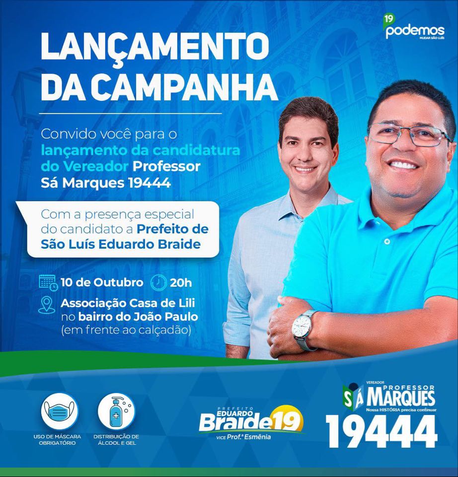 O Vereador e candidato a reeleição nas eleições do próximo 15 de Novembro, Professor Sá Marques, lança oficialmente sua candidatura neste sábado (10), a partir das 20h, na Associação Casa de Lili, no bairro do João Paulo.
