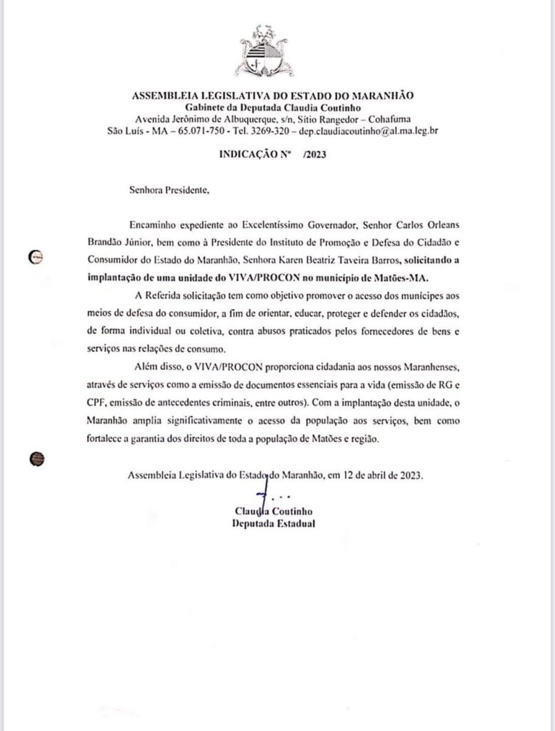 A deputada estadual Cláudia Coutinho apresentou Indicação solicitando a implantação de uma unidade do Viva Procon na cidade de Matões.