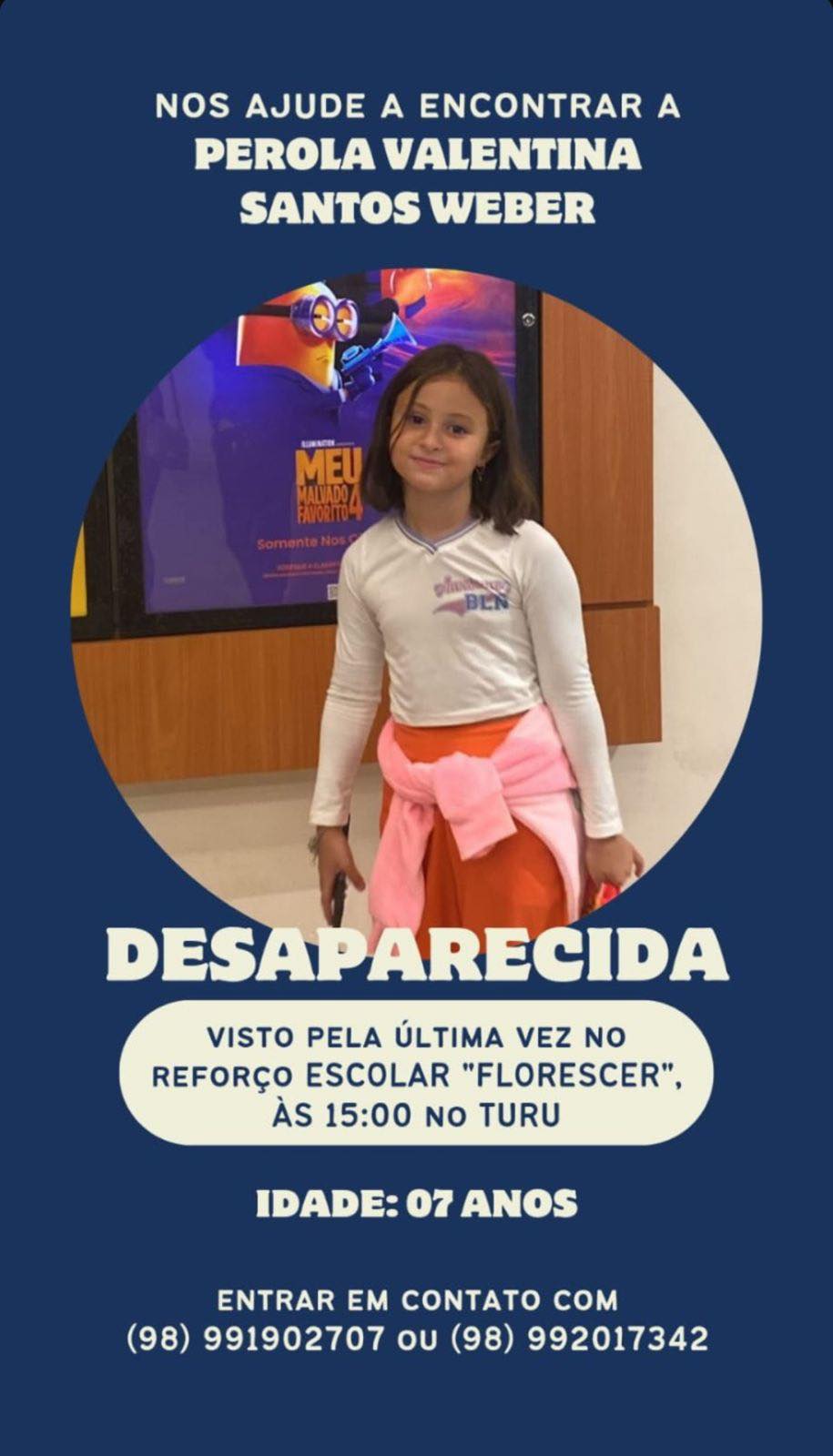 Uma menina de 7 anos chamada Pérola Valentina , está desaparecida desde a tarde dessa quinta-feira (22), após ser levada pelo próprio pai, sem o consentimento da mãe. O incidente ocorreu por volta das 15h no reforço escolar, localizado no Bairro Turu.