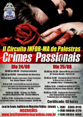 O Instituto Informaranhão realiza, nos dias 24 e 25 deste mês, no auditório do Ministério Público (Jaracati), o II Circuito INFOR-MA de Palestras, com o tema “Crimes Passionais”. Em tempos de violência acentuada entre os gêneros sexuais, motivada, sobretudo, por vingança afetiva, a discussão desses conflitos é oportuna como meio de esclarecimento e até mesmo como mecanismo de prevenção.