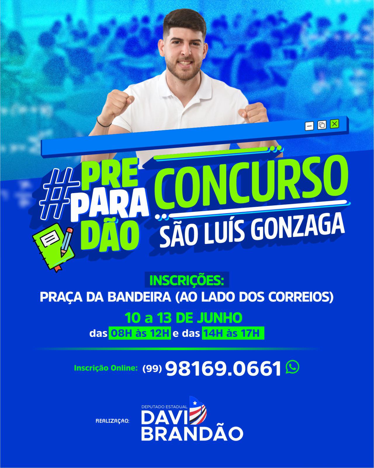 Em uma ação voltada para a educação e a capacitação profissional, o Deputado Estadual Davi Brandão, (PSB) está trazendo para São Luís Gonzaga do Maranhão o “Preparadão Concurso São Luís Gonzaga”. As incrições serão de 10 à 13 de julho, na praça da Bandeira, ao lado dos Correios.