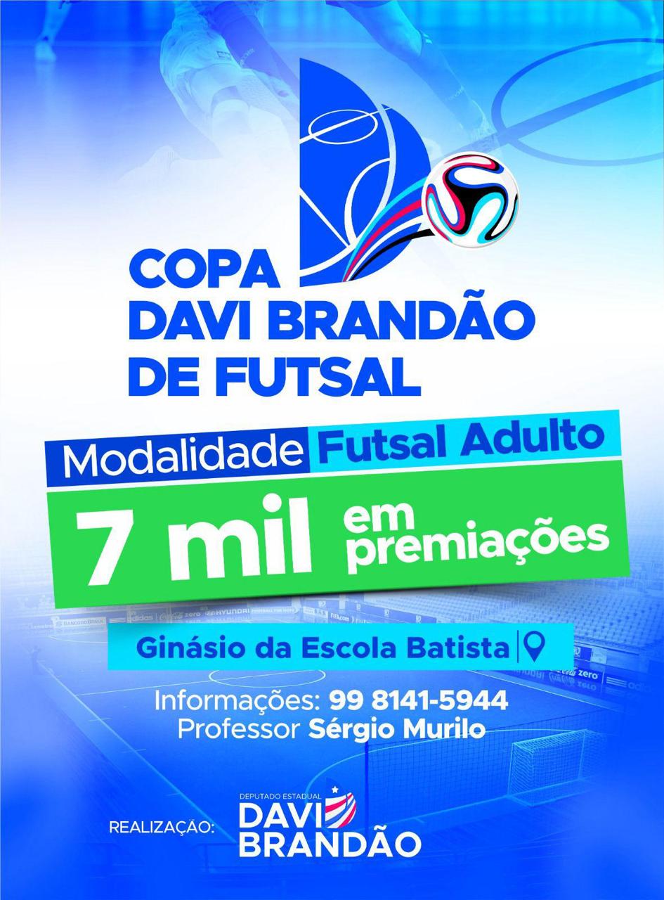 O Deputado Estadual Davi Brandão,(PSB/MA) realizará a primeira edição da Copa Davi Brandão de Futsal, um torneio que promete movimentar o cenário esportivo de Bacabal nos próximos meses. Com a intenção de promover a prática esportiva, o evento será realizado no Ginásio da Escola Batista, com abertura marcada para o dia 16 de março e encerramento para o dia 17 de abril, aniversário da cidade de Bacabal.