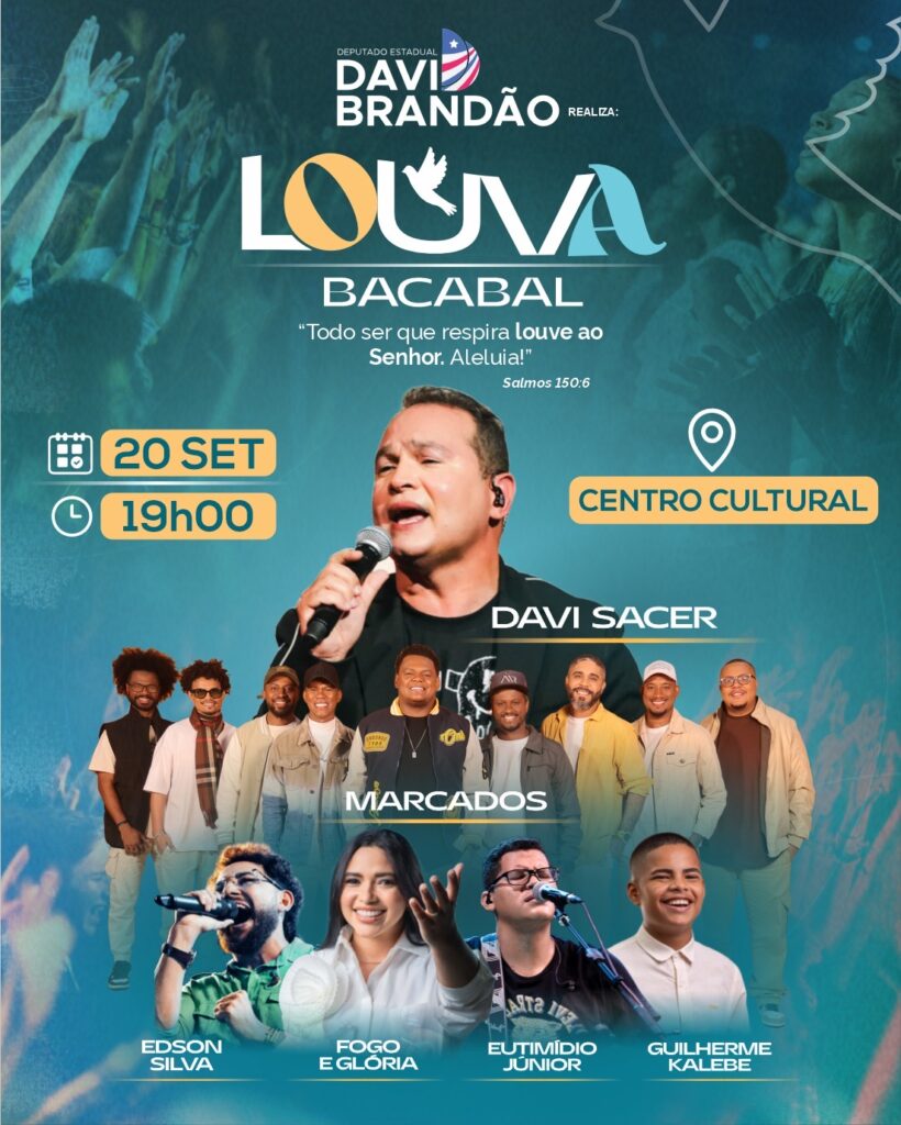 O deputado estadual Davi Brandão, (PSB/MA), está realizando o primeiro Louva Bacabal, um evento gratuito que acontecerá no dia 20 de setembro, às 19h, na praça da Bíblia. O evento promete reunir a população em uma celebração de fé e união, com atrações musicais de destaque, incluindo a banda Marcados, cantor Edson Silva, Fogo e Glória e Eutimidio Jr..
