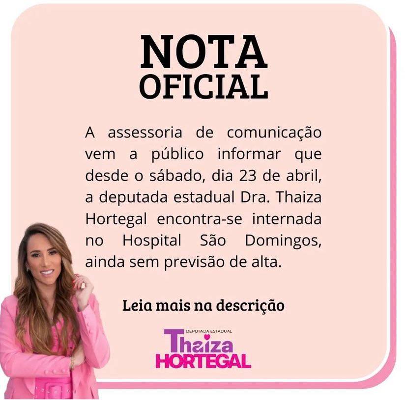 A deputada estadual Thaiza Hortegal, ex-primeira dama de Pinheiro, está internada no hospital São domingos desde o último sábado (23). O diagnóstico é insuficiência renal aguda. Ela também já está sendo submetida a sessões de hemodiálise, que deverá se estender ao longo de toda esta semana.