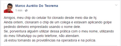 O deputado estadual Marco Aurélio divulgou na tarde desta quinta-feira (01), via rede social, que o chip do seu aparelho celular foi clonado. Ele alertou ainda, caso alguém ligue em seu nome, para que a pessoa não atenda e nem responda a mensagens. O parlamentar informou também que já está tomando as devidas providências.