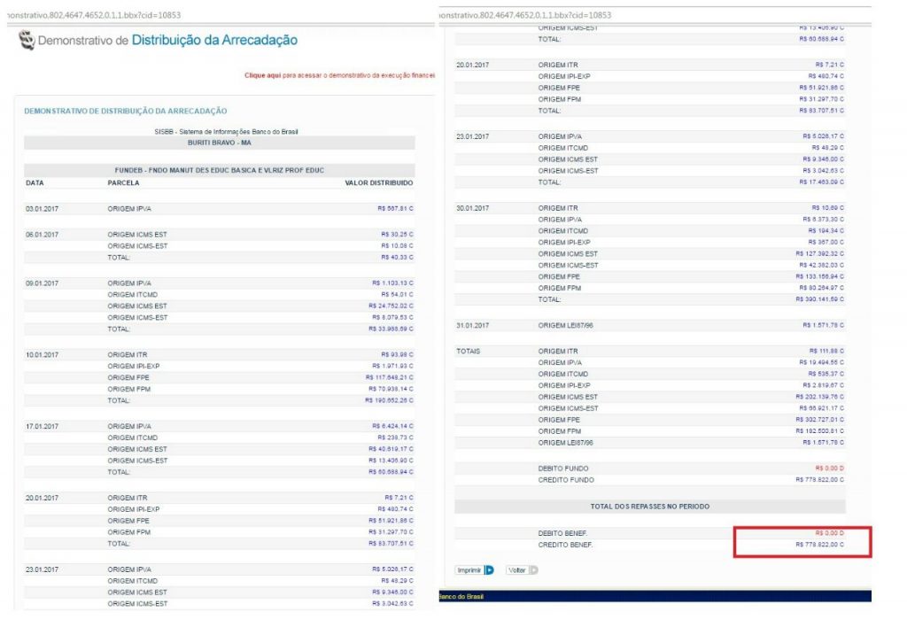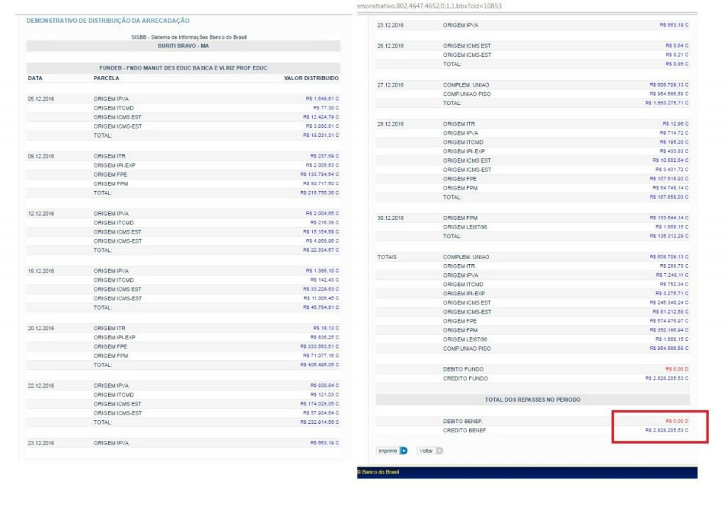 O que causa estranheza sobre o não pagamento, é o fato do município de Buriti Bravo ter recebido em dezembro de 2016, só de FUNDEB, o valor de R$ 2.828.205,53 (dois milhões, oitocentos e vinte e oito mil, duzentos e cinco reais e cinquenta e três centavos), conforme mostra a página do Banco do Brasil.