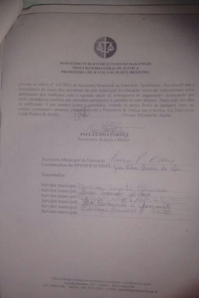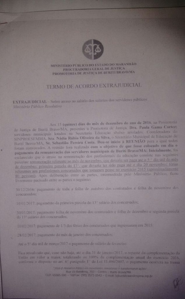 O Ministério Público foi acionado, e em conjunto com o secretário municipal de Educação e representantes dos servidores, foi feito um TERMO DE ACORDO EXTRA JUDICIAL para que os pagamentos fossem colocados em dia. No entanto, até o presente momento, a tabela que consta neste acordo não vem sendo cumprida. Os servidores ainda estão com os salários de dezembro e janeiro em atraso, além da segunda parcela do décimo terceiro de 2016.