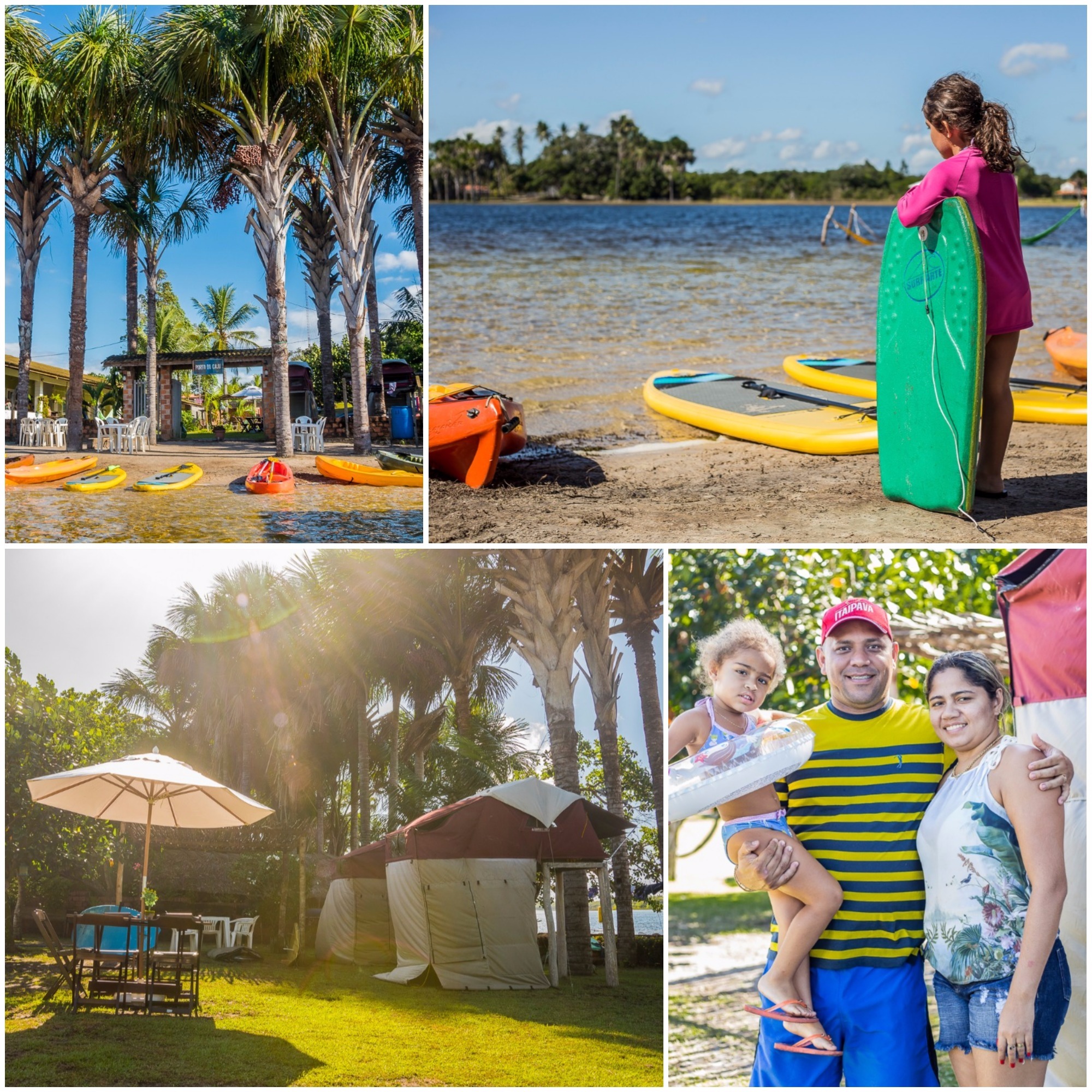 Já para os mais aventureiros, como a família Gomes Leão, a pousada possui barracas de camping, que ficam a um metro e meio de altura do chão. O valor cobrado é de 150 reais para o casal.
