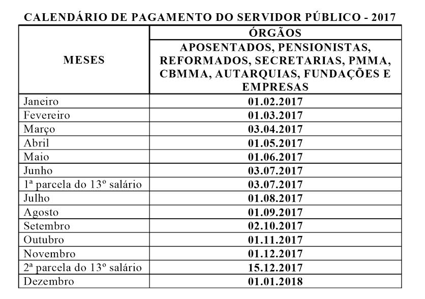 O Governo do Maranhão divulgou o calendário de pagamento dos servidores públicos estaduais para o ano de 2017. As datas estabelecidas serão sempre os dois primeiros dias úteis do mês e as parcelas do 13º salário serão pagas nos meses de julho e dezembro, respectivamente.