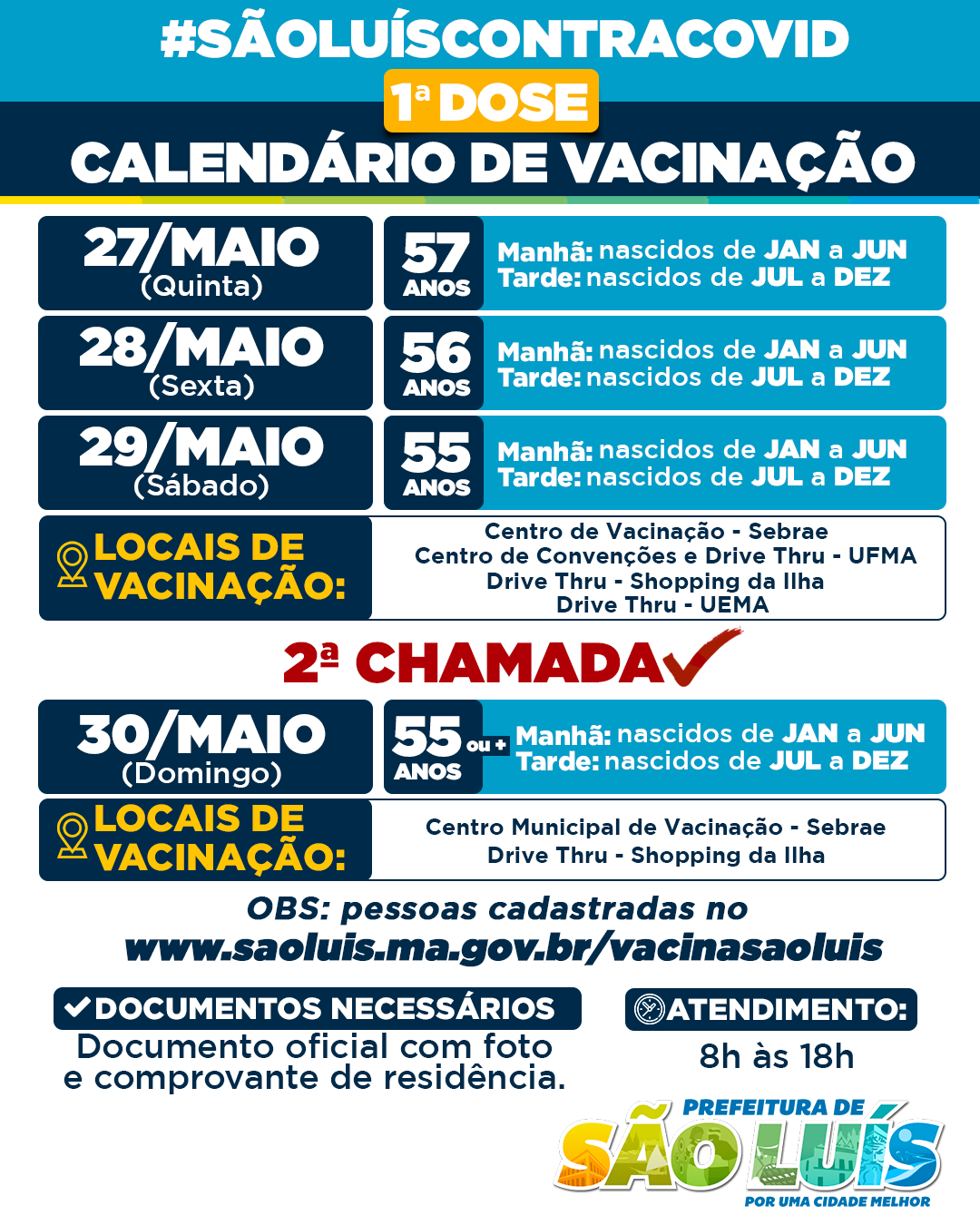 Com a chegada das novas doses a Prefeitura de São Luís avança no calendário. Nesta quinta-feira (27) serão vacinadas as pessoas de 57 anos; na sexta-feira (28) será a vez de quem tem 56 anos; no sábado (29) vacina o público de 55 anos. No domingo (30) acontece a segunda chamada para quem tem a partir de 55 anos e ainda não tomou a primeira dose da vacina contra Covid-19.