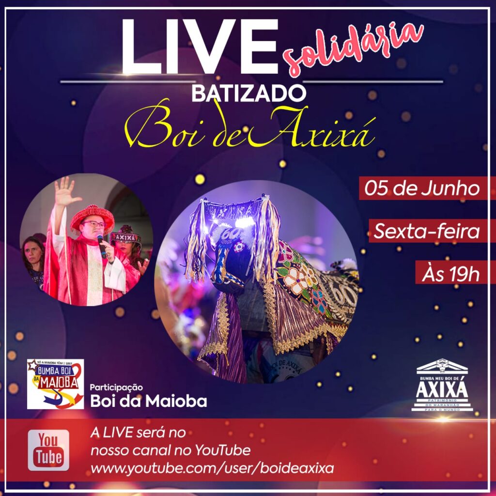 A live solidária do batizado do Boi de Axixá será transmitida nesta sexta-feira (5), às 19h, pelo canal do YouTube grupo, no seguinte endereço eletrônico: https://www.youtube.com/BoideAxixa.