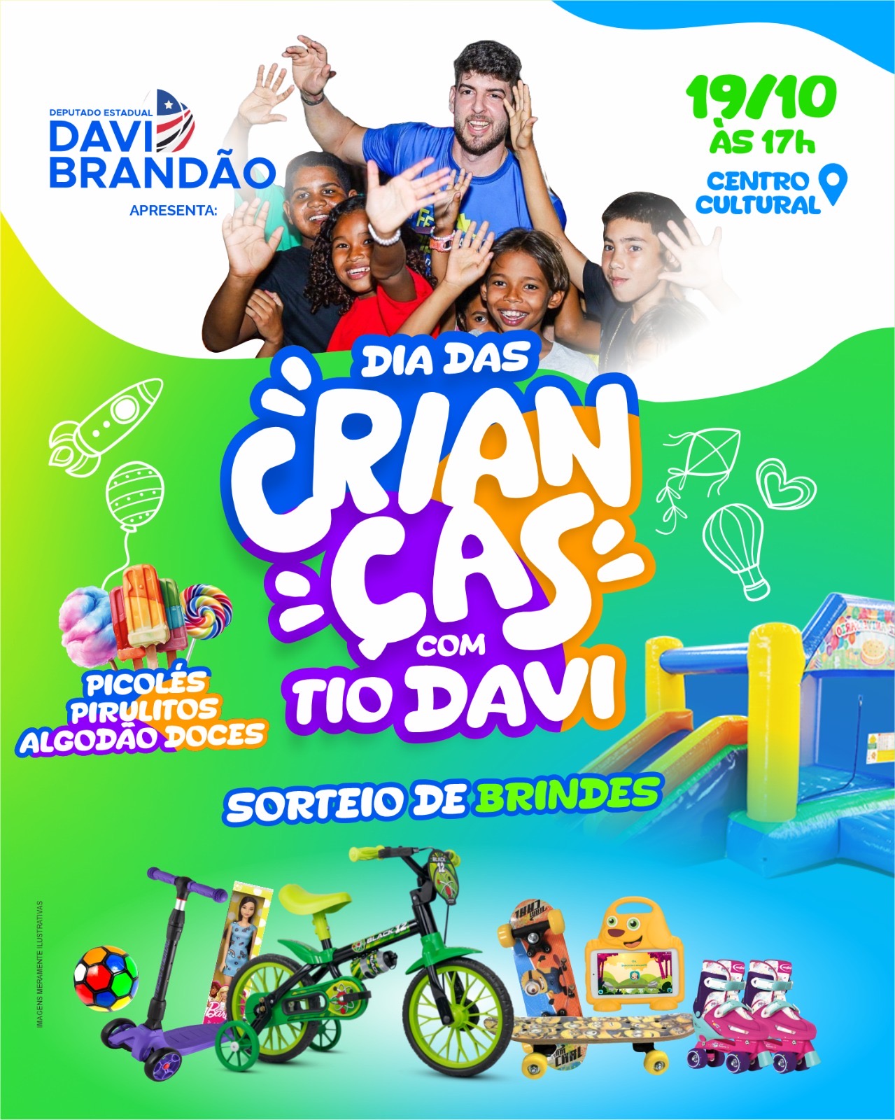 O deputado estadual Davi Brandão está organizando a segunda edição do evento “Um Dia das Crianças com Tio Davi” em Bacabal. A festa, que acontece neste sábado (19), a partir das 17h, no Centro Cultural , tem como objetivo celebrar o Dia das Crianças, proporcionando diversão, brincadeiras, entrega de brinquedos e sorteio de prêmios.