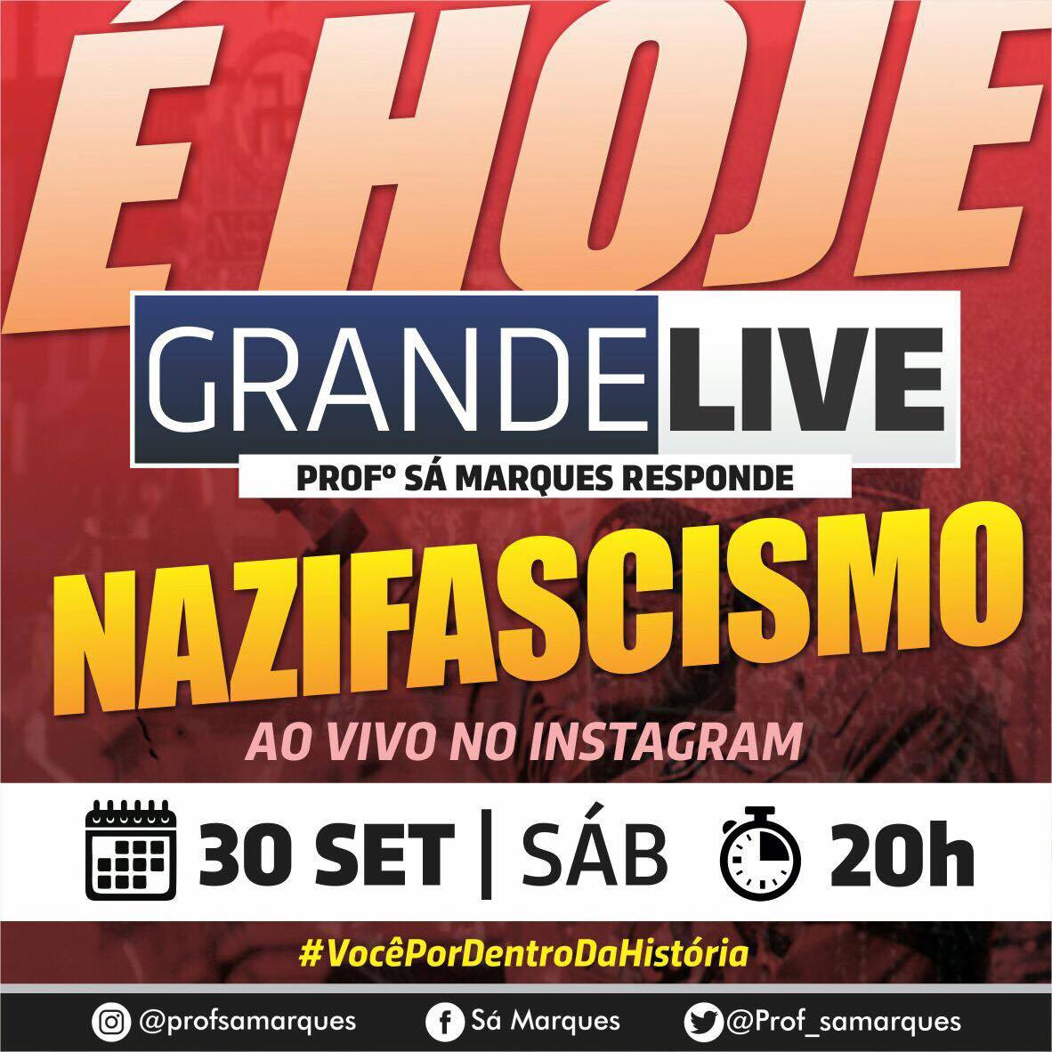 Neste sábado (30), o Professor Sá Marques, vai prosseguir com as aulas online em sua rede social. Desta vez, o assunto será o “Nazifascismo”. As aulas online proferidas por Sá Marques tem repercutido bastante, já que é mais uma forma de ajudar as pessoas que estão se preparando para o ENEM. Este já é o terceiro sábado de aulas online.