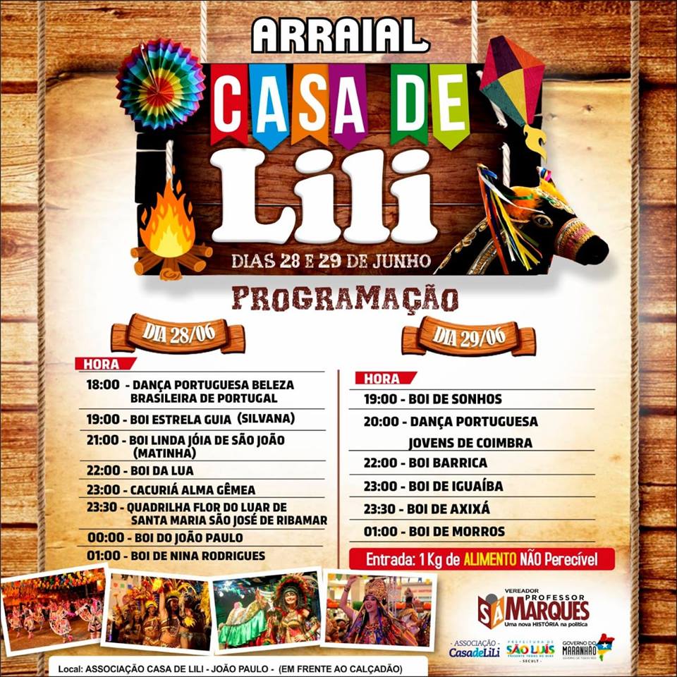 Começa hoje o Arraial mais charmoso e colorido de São Luís. Trata-se do Arraial “Casa de Lili”, que, como no ano passado, terá dois dias de festa na Associação que tem o mesmo nome, no bairro do João Paulo. O festejo junino é uma realização do Vereador Sá Marques, com o apoio da Prefeitura de São Luís e Governo do Estado. O Arraial começa nesta quinta-feira (28) e continua amanhã (29).