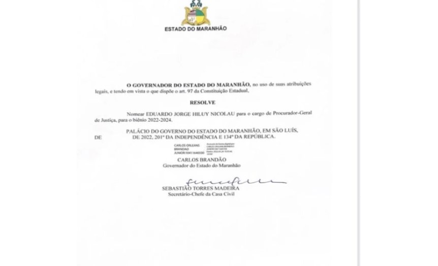 O governador do Maranhão, Carlos Brandão, nomeou, na manhã desta terça-feira, 24, Eduardo Jorge Hiluy Nicolau, para o cargo de procurador-geral de justiça no biênio 2022-2024. Com isso, o atual PGJ permanece à frente do Ministério Público do Maranhão.