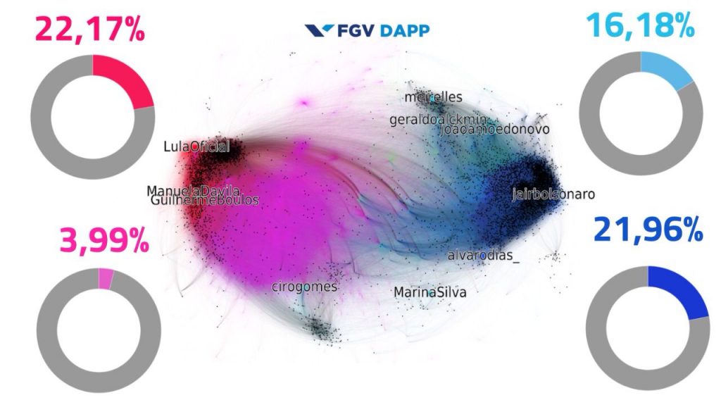 As interações motivadas pela ação de robôs corresponderam a 22,1% das postagens no Twitter de perfis ligados ao campo da esquerda, alinhados ao PT; outros 21,9% à esfera de direita conservadora, ligados à Bolsonaro; e 16,1% ao campo do centro e 3,99% à centro-esquerda, mas sem predomínio de nenhum candidato em particular.