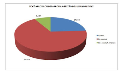 Sobre avaliação da administração do prefeito de Timon, Luciano Leitoa (PSB), quando perguntado aos entrevistados “Você aprova ou desaprova a gestão de Luciano Leitoa?”, o resultado da pesquisa aponta que 67,44% desaprovam e 24,04% aprovam. “Não sabem/Não Opinou” foram 8,52%.