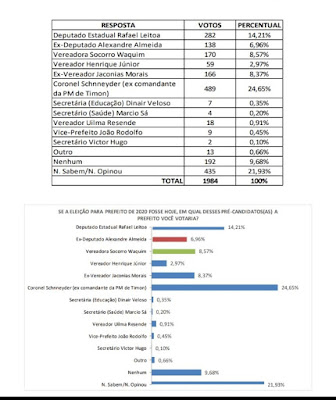 O Coronel Schneyder aparece como o favorito para vencer a eleição para prefeito de Timon em 2020, segundo pesquisa realizada entre os dias 30 de setembro e 2 de outubro pelo Instituto de Opinião Pública JM.