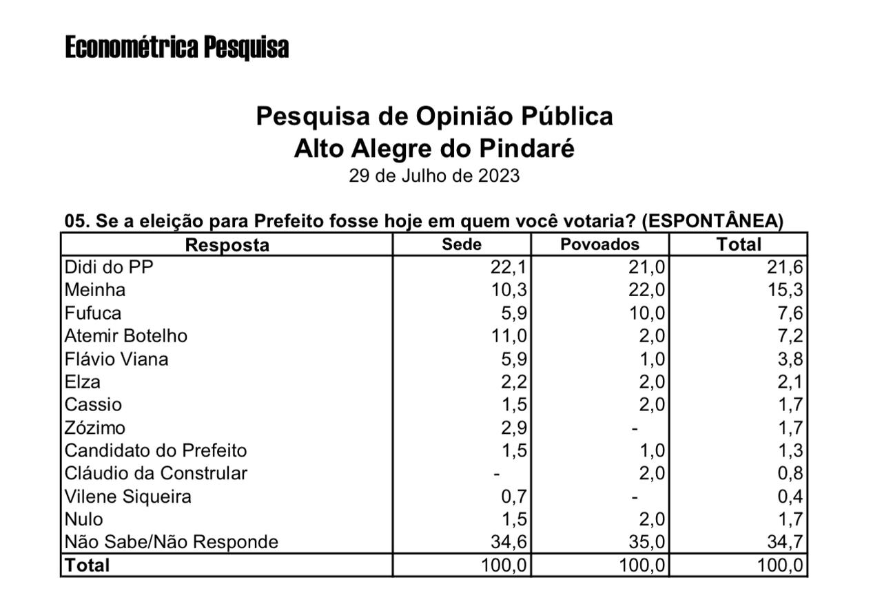 No município de Alto Alegre do Pindaré, por exemplo , o pré-candidato a prefeito , Didi do PP, lidera na espontânea para suceder o atual prefeito, Fufuca Dantas, obtendo a intenção de voto de 21,6% dos entrevistados . Em segundo lugar, aparece o pré-candidato, Meinha , com 15,3%.