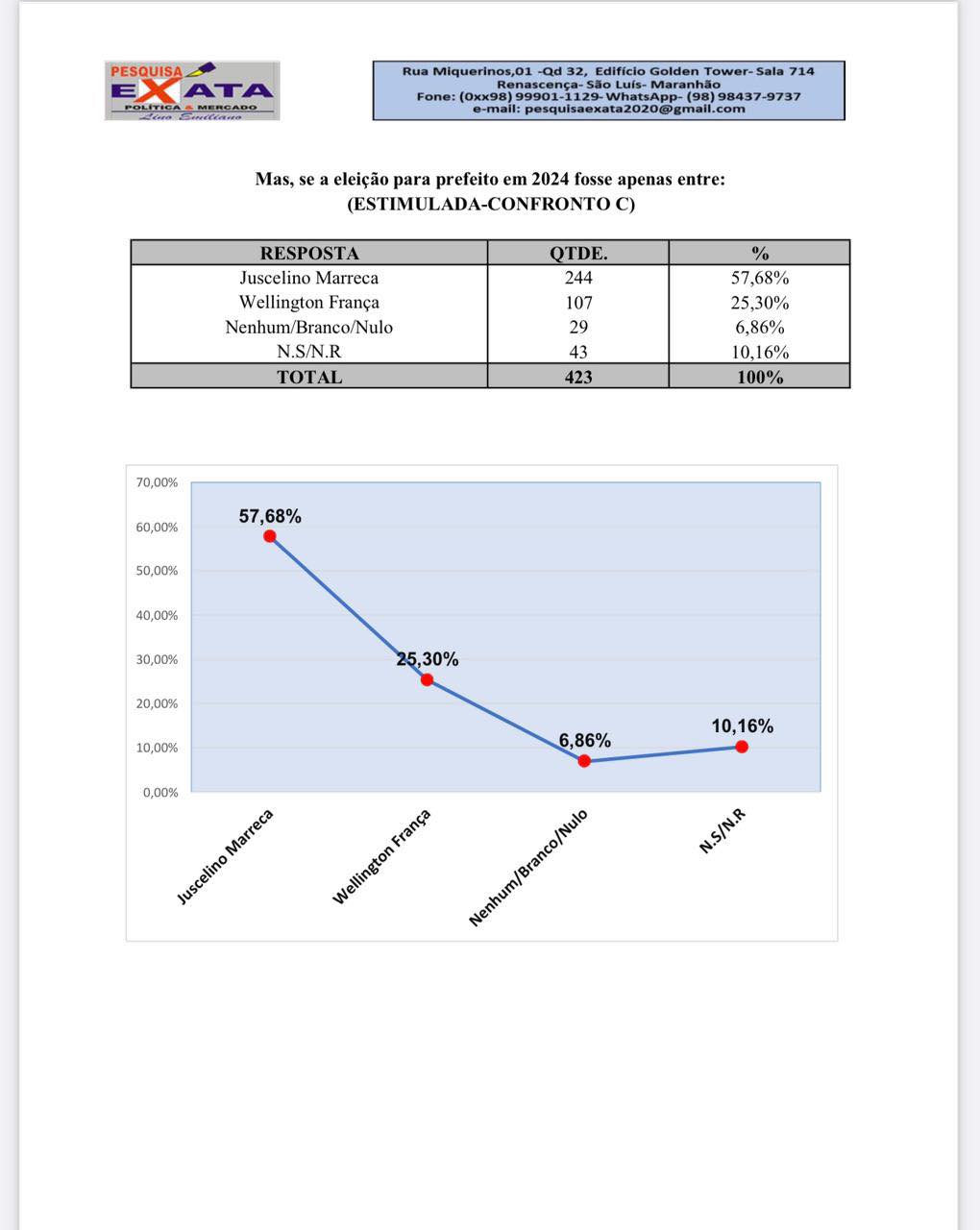 Na pesquisa da Exata, Juscelino Marreca aparece em primeiro lugar, com 57,68%. Em segundo lugar, aparece o sobrinho da atual Prefeita, Wellington França, com 25,30%, provável candidato a sua sucessão.