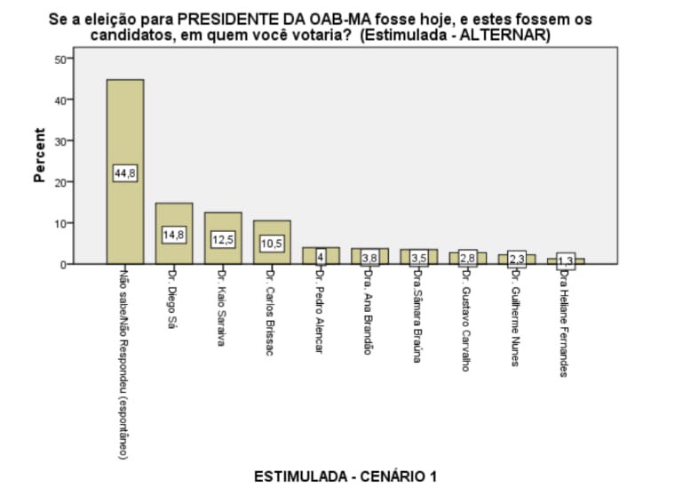 No Cenário 1, estimulado, Diego Sá aparece com 14,8% contra 12,5% de Kaio Saraiva, anunciado por Thiago Diaz, atual presidente, como seu sucessor. Em terceiro, aparece Carlos Brissac com 10,5%. Logo depois surgem Pedro Alencar com 4%; Ana Brandão com 3,8%; Sâmara Braúna com 3,5%; Gustavo Carvalho com 2,8%; Guilherme Nunes com 2,3% e Heliane Fernandes com 1,3%.