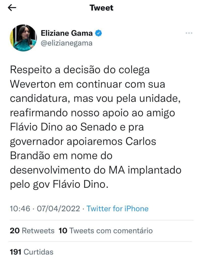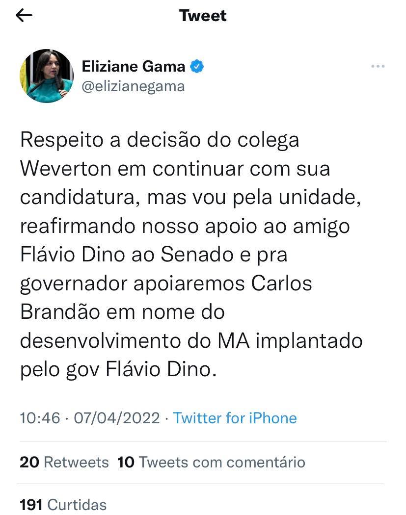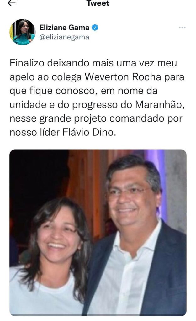 E o que já era esperado, finalmente aconteceu! A senadora Eliziane Gama, que fala uma coisa no café da manhã e não se sustenta até o jantar, sacou do foguete de Weverton Rocha e declarou apoio à pré-candidatura de Carlos Brandão ao Governo do Maranhão.