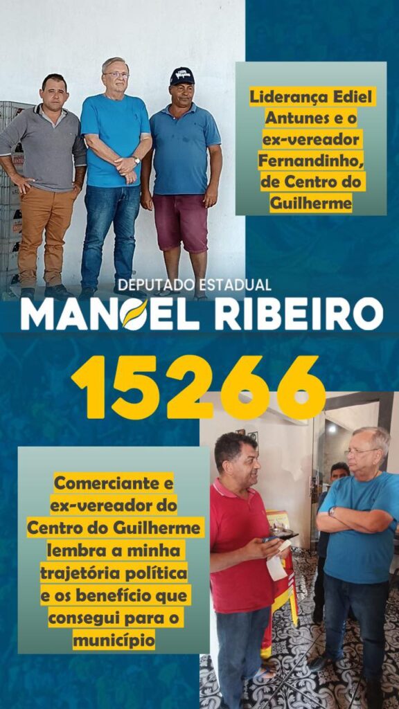 Há vinte dias da eleição, o candidato a deputado estadual Manoel Ribeiro, tem intensificado sua agenda de campanha pelo interior do Maranhão. Desta vez, Manoel foi até o município de Centro do Guilherme, onde se reuniu com lideranças políticas, a exemplo do ex-vereador e ex-presidente da Câmara Fernandinho, o Francisco, irmão da ex-prefeita Irene, assim como o Ediel, representante dos produtores do Centro do Guilherme e Antônio Carlos, da cidade de Maracaçumé.