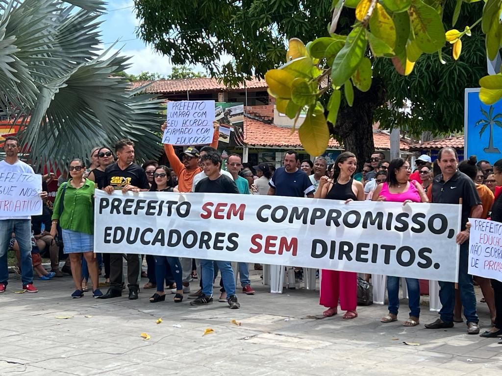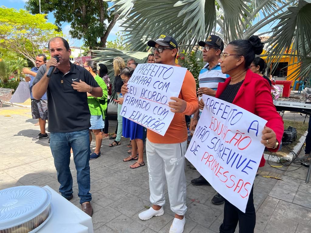 Com faixas e cartazes, os educadores reivindicam direitos da promoção, da progressão e o retroativo de 5 meses do acordo que consta no ofício 362/2023 firmado pela gestão municipal, em agosto deste ano. Além dos direitos da categoria, os professores aproveitaram o momento para protestar pela qualidade da merenda escolar e transporte escolar digno para os alunos, já que ônibus quebrados tem sido uma reclamação frequente de pais e alunos.