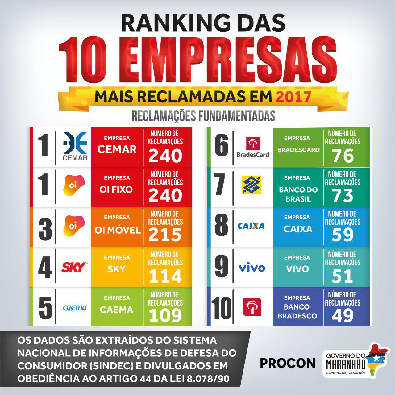 Cabe ressaltar que o ranking é baseado somente nas reclamações fundamentadas não atendidas, isto é, aquelas em que a análise das provas constatou as infrações. Para conferir as informações completas, acesse o site :www.procon.ma.gov.br.