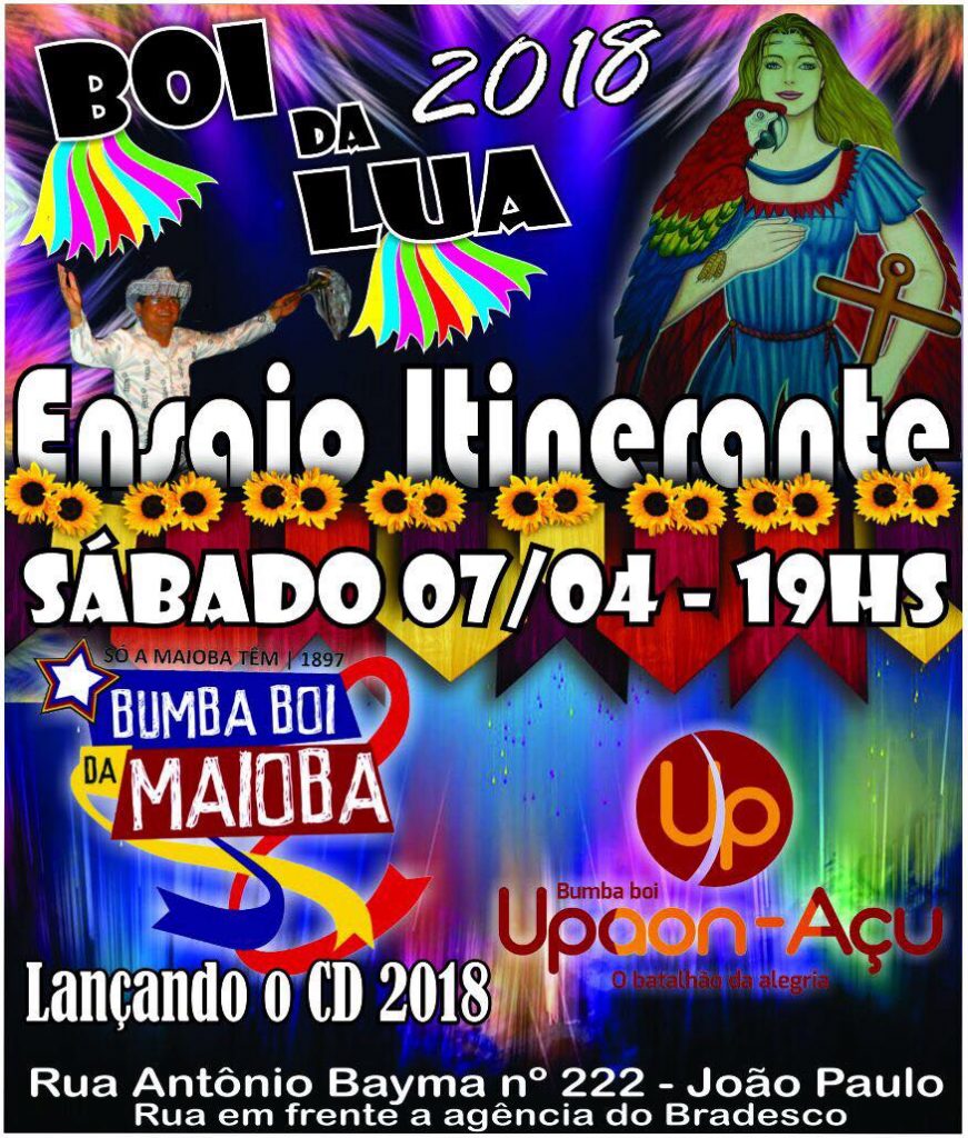 Tudo pronto para o Ensaio Itinerante do Boi da Lua 2018. A festa acontece no próximo sábado, dia 07 de Abril, a partir das 19h, na Rua Antônio Bayma, no bairro do João Paulo. O vereador Sá Marques, grande incentivador da cultura maranhense, está dando total apoio ao evento, ao lado do também vereador Antônio Garcez.