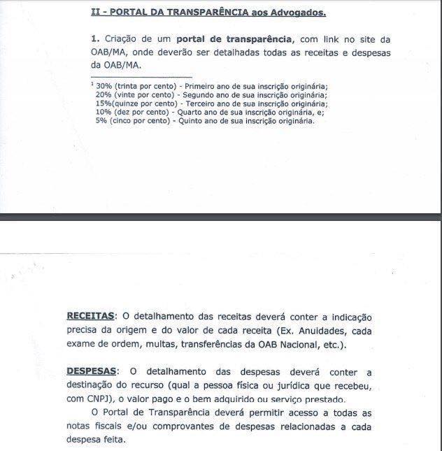 Ainda de acordo com a denúncia de Alencar, nada disso consta no Portal de Transparência da OAB/MA. Vale lembrar que, em 2015, as diretrizes defendidas pelo grupo “Renovar para todos”, de Thiago Diaz e José Alencar, eram claras em relação ao Portal de Transparência: “o detalhamento das despesas deverá conter a destinação do recurso (qual a pessoa física ou jurídica que recebeu, com CNPJ), o valor pago e o bem adquirido ou serviço prestado”.