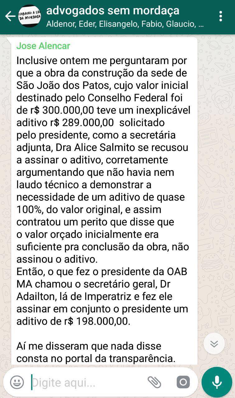 Alencar disse ainda, o que piora ainda mais as coisas para Diaz, que a Secretária-Adjunta da OAB/MA, Alice Salmito, se recusou a assinar o aditivo, argumentando que, de acordo com laudo pericial, o valor inicial seria mais que suficiente para a conclusão da obra. Não satisfeito, Thiago Diaz teria convocado o Secretário-Geral, Adailton, de Imperatriz, para assinar em conjunto um aditivo de R$ 198.000,00 (cento e noventa e oito mil reais).