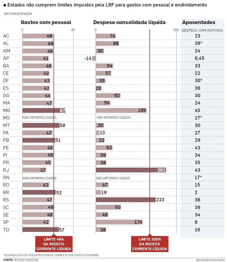 A reportagem do Estadão conta que, de acordo com relatório do Tesouro, Minas Gerais, Mato Grosso, Paraíba, Roraima e Tocantins gastaram mais do que o permitido com o salário de servidores no ano passado.