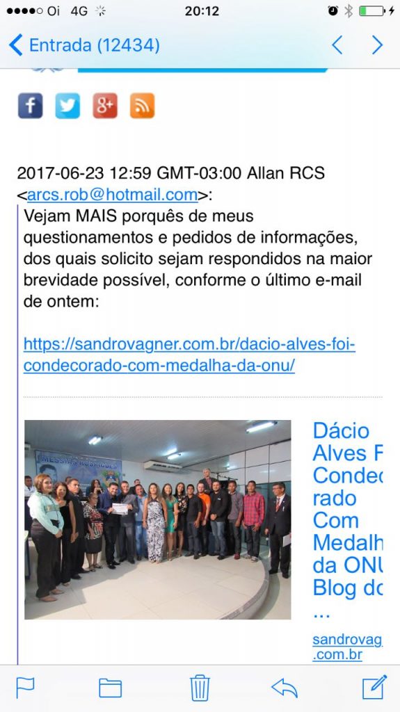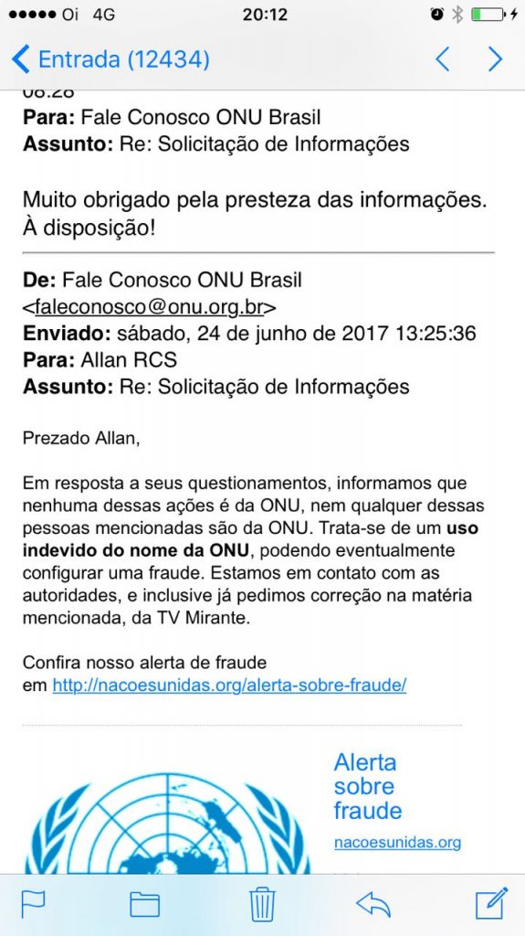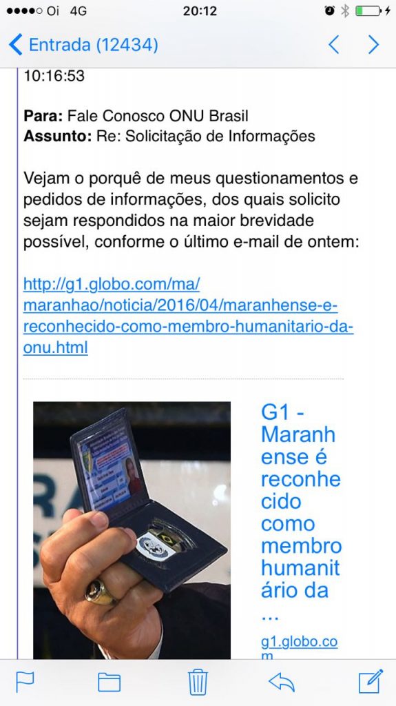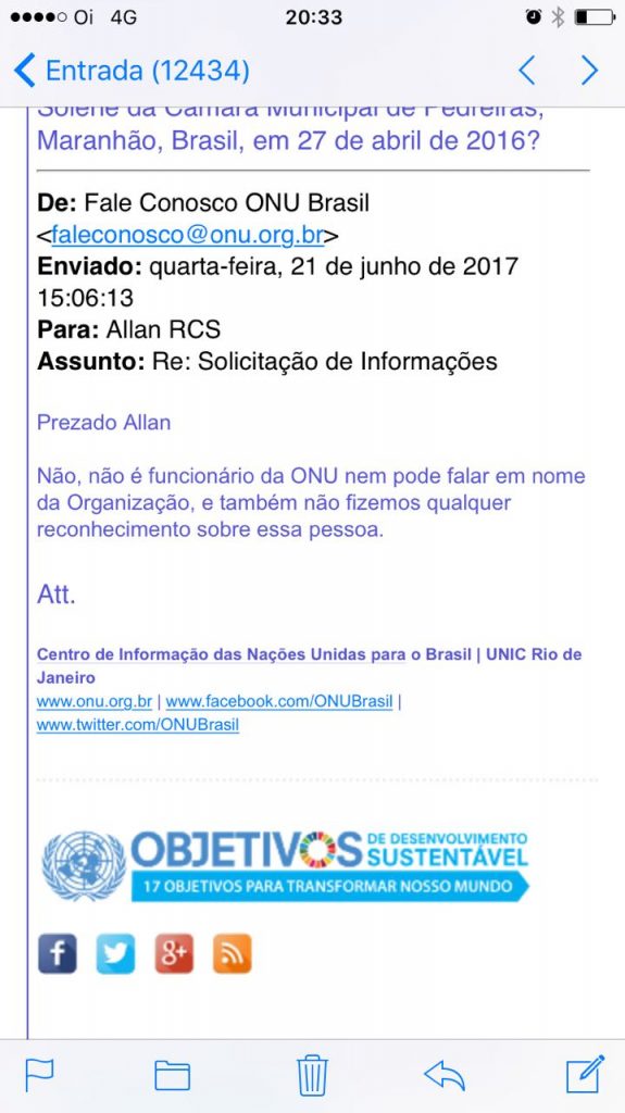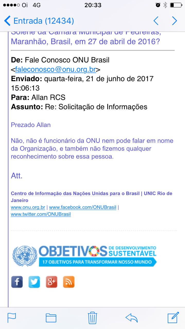 Abaixo, a troca de e-mails entre representantes da ONU e Dr. Allan Roberto, que comprova a farsa montada por Dacio Viana.