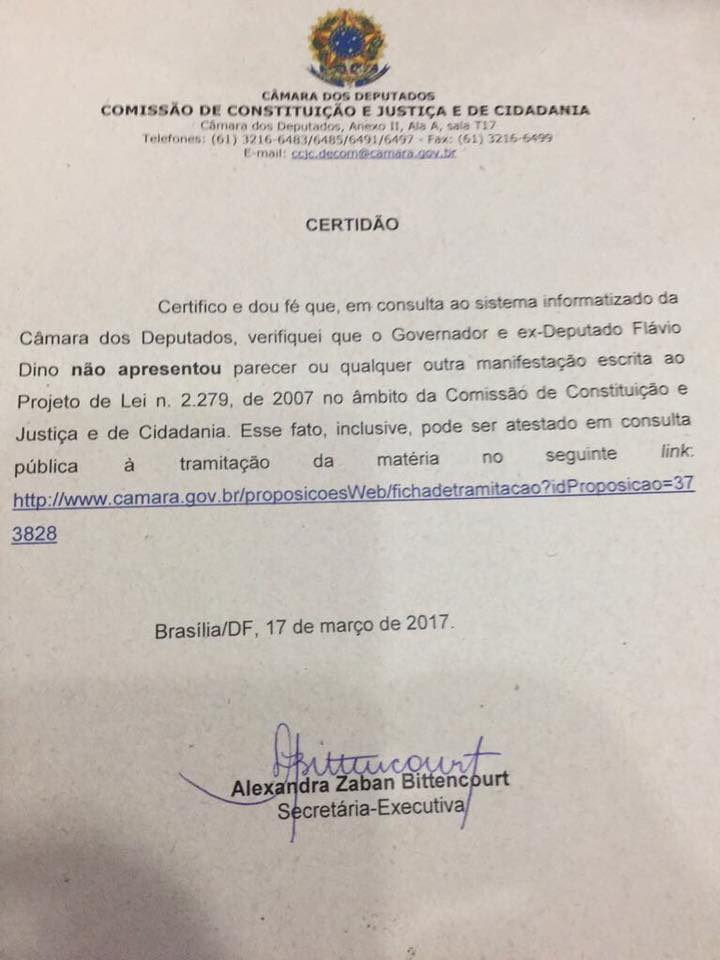 O governador Flávio Dino apresentou uma certidão, da Câmara dos Deputados, comprovando que o Projeto de Lei nº 2.279, de 2007, que não é de sua autoria e vetava a aplicação no Brasil de leis estrangeiras que afetem o comércio internacional, jamais foi votado. “Fui designado Relator do projeto acerca de proteção a investimentos em Cuba contra Estados Unidos. Mas jamais apresentei parecer, voto, nada“, afirmou. O projeto em questão atribuiria segurança jurídica a investimentos do grupo Odebrecht e Dino, segundo delação, teria pedido R$ 400 mil de ajuda financeira à sua campanha de governador em 2010 em troca de um parecer favorável que nunca aconteceu.