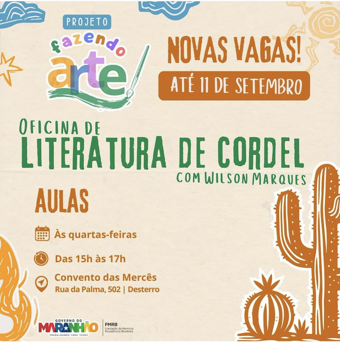 Sob a orientação do escritor de literatura infanto-juvenil Wilson Marques e participação do jornalista e cordelista Paulinho Nó Cego e do artista plástico Airton Marinho, crianças de 9 a 12 anos poderão explorar a imaginação e criar versos relacionados à escrita cordelista, traduzindo experiências e sentidos a uma das mais importantes marcas da cultura nordestina.