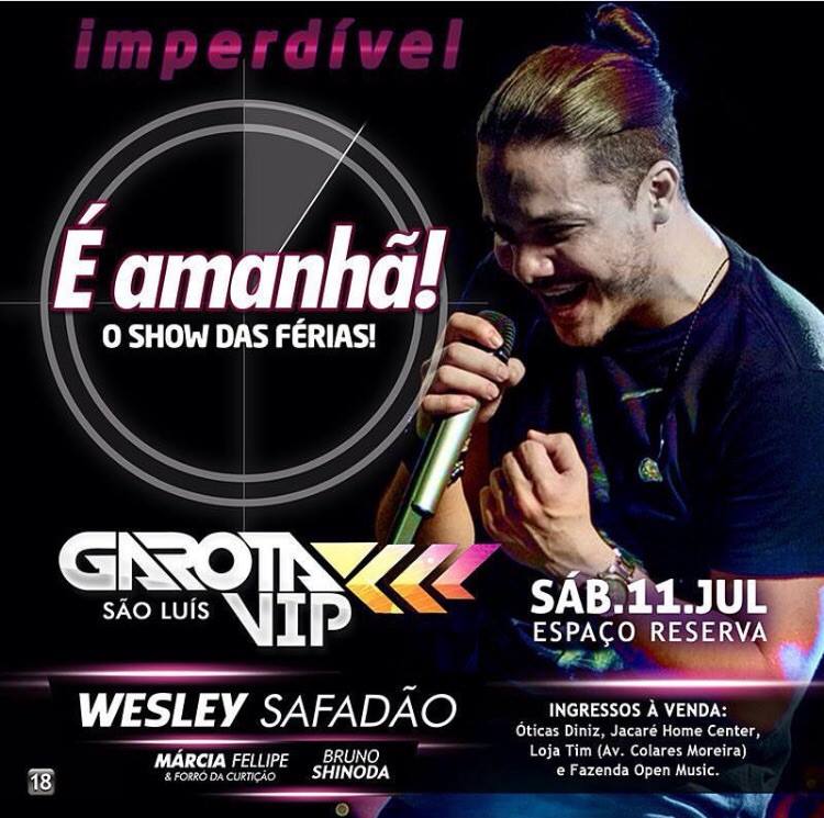 Wesley Safadão e a banda Garota Safada aportam neste sábado, dia 11 de Julho, no Espaço Reserva, em São Luís. Desta vez o músico traz o projeto Garota VIP, uma “tour” bem diferente das outras já apresentadas pelo maior artista do forró na atualidade no Brasil.