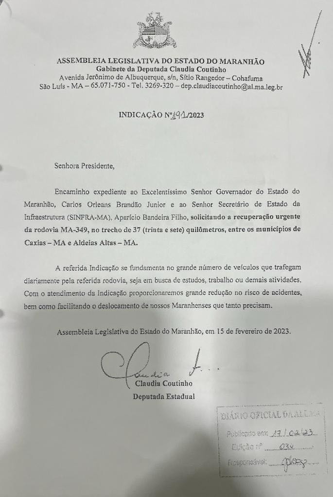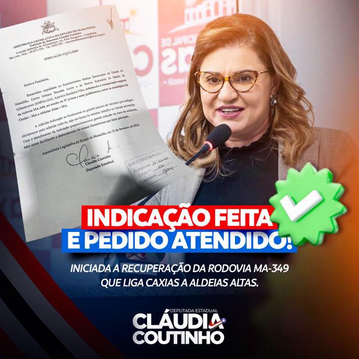 Os moradores de Caxias e Aldeias Altas tem muito o que comemorar. Por indicação da deputada estadual Cláudia Coutinho, o Governo do Maranhão, por meio da Secretaria de Infraestrutura, já deu início as obras de recuperação da rodovia MA-349, que liga os dois municípios.