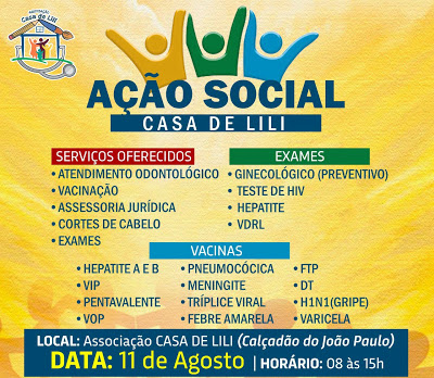 A população do João Paulo e adjacências se prepara para receber uma grande ação social nesta sexta-feira, 11 de Agosto, e o local escolhido foi a Casa de Lili. Na ação, prevista para começar as 08h da manhã, serão oferecidos gratuitamente diversos serviços, entre eles: atendimentos odontológicos, assessoria jurídica, vacinação, exames oftalmológicos, dentre outros. A ação conta com apoio da Prefeitura Municipal de São Luís e do Vereador Professor Sá Marques.