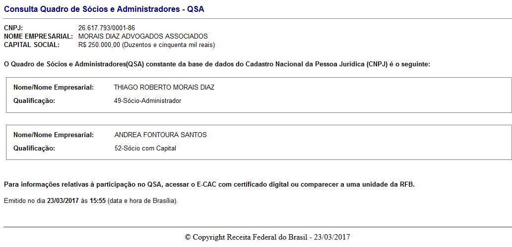 E não foi só a empresa de comunicação que foi criada depois da posse. O presidente Thiago Diaz constituiu sociedade de advogados com capital social de R$ 250 mil em 07/10/2016.